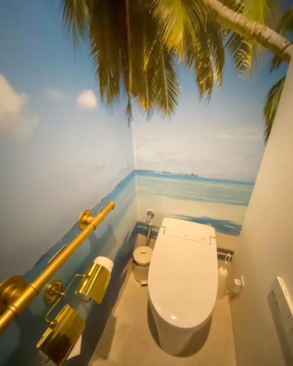 | 詳細情報 | トイレ交換の工事をしました。 南国風にしたいということで海の風景の写真を特殊なプリンターでプリントしたクロスを使用しました。 また床は砂浜をイメージしたクッションフロア、ペーパーホルダーと手すりはゴールドでゴージャス感を演出しました。 |
