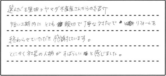 短い工期内にとても親切で丁寧な対応でリフォームを終わらせていただき感謝しています。