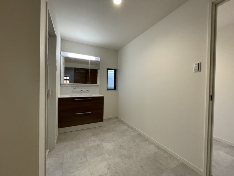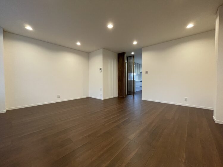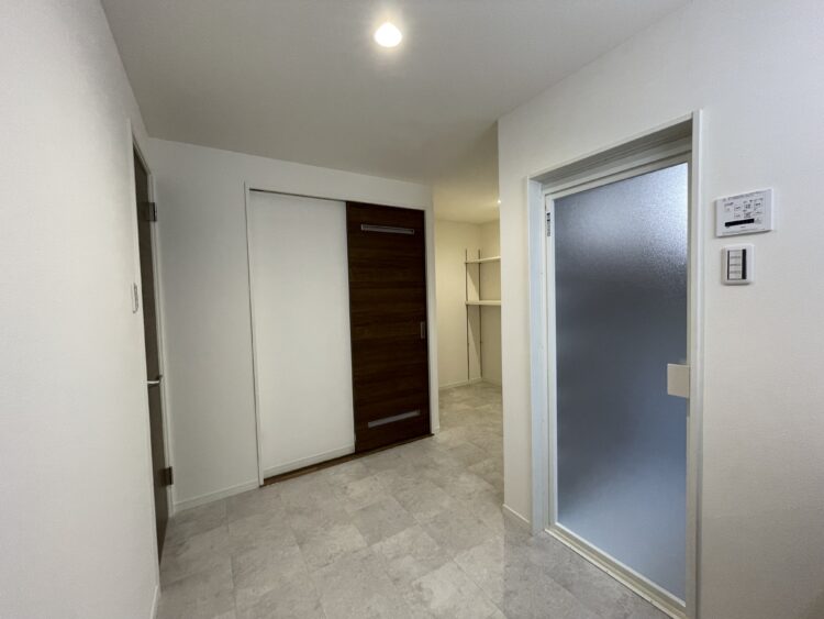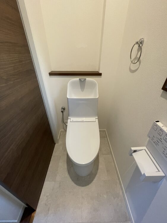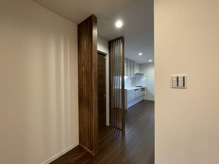 1階のトイレ入口に間仕切りルーバーを設置することでLDKとのゾーニングをしてトイレの存在感を減らしました。
