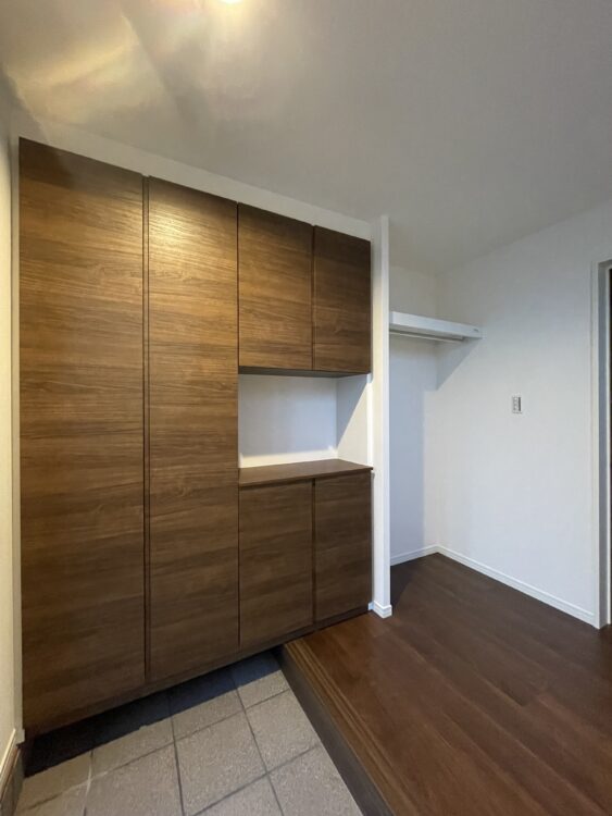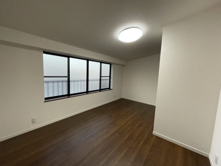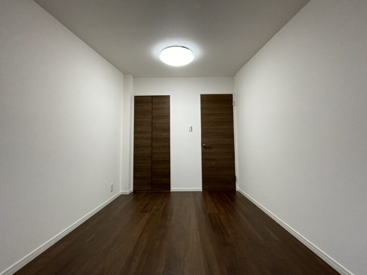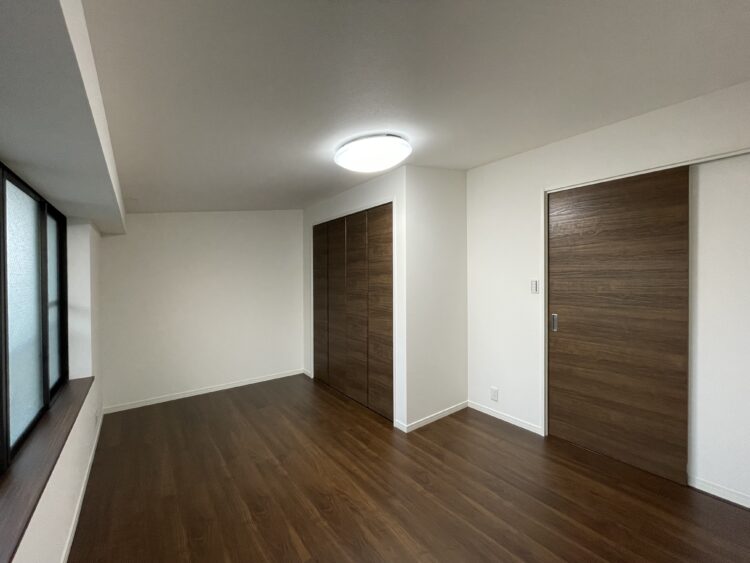建具、床を濃い色にすることで壁紙とのコントラストをはっきりさせ、モダンテイストに仕上がりました。